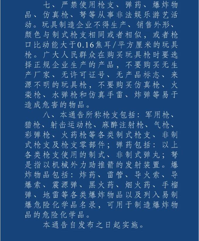 七、嚴(yán)禁使用槍支、彈藥、爆炸物品、仿真槍、弩等從事非法娛樂游藝活動(dòng)。玩具制造企業(yè)不得生產(chǎn)、銷售外形、顏色與制式槍支相同或者相似,或者槍口比動(dòng)能大于0.16焦耳/平方厘米的玩具槍。廣大人民群眾在購(gòu)買玩具槍時(shí)要選擇正規(guī)企業(yè)生產(chǎn)的產(chǎn)品,不要購(gòu)買無(wú)生產(chǎn)廠家、無(wú)許可證號(hào)、無(wú)產(chǎn)品標(biāo)志、來(lái)源不明的玩具槍,不要購(gòu)買仿真槍、火柴槍、水彈槍和仿真手雷、炸彈等易于造成危害的物品。